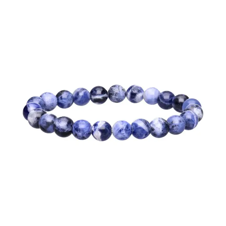 Laissez-vous envoûter par les teintes bleu azur et les veines blanches marbrées de notre bracelet en Sodalite. Chaque perle de 8mm est une pièce unique, rappelant la profondeur d’un ciel nocturne parsemé de nuages légers. Son poli miroir offre un toucher soyeux et une présence discrète mais puissante à votre poignet.