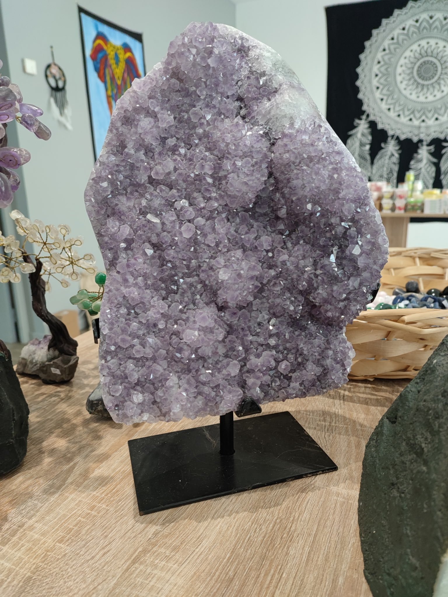 Montée sur un pied solide, cette géode est idéale pour décorer une maison, un bureau ou un espace de méditation. En plus de son aspect envoûtant, l’améthyste est appréciée pour ses propriétés apaisantes, favorisant une atmosphère relaxante. Elle attire positivement l’attention tout en diffusant des vibrations harmonieuses.