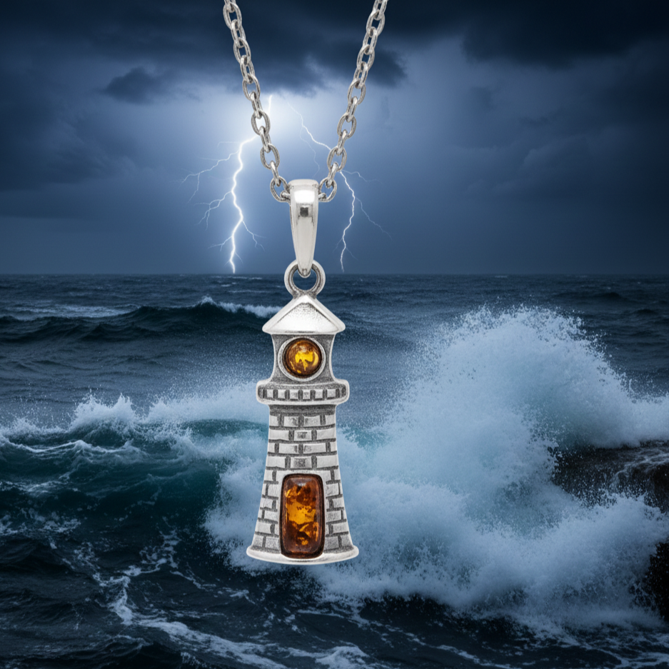 Illuminez votre décolleté avec ce pendentif en forme de phare, une pièce unique qui évoque l’appel du large. Nous avons conçu ce bijou pour les amoureux de la mer et des symboles forts. Il marie l’éclat durable de l’argent précieux à la chaleur millénaire de l’ambre.