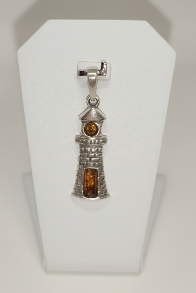 L’Éclat Solaire de l’Ambre Nous avons inséré deux pièces d’ambre naturel de couleur cognac au cœur de la structure. Une petite perle ronde figure la lanterne au sommet, tandis qu’une pierre rectangulaire orne la base du phare. Ces gemmes organiques captent la lumière naturelle et rappellent la lueur protectrice des gardiens de la côte. Chaque inclusion dans l’ambre rend votre pendentif absolument unique.
